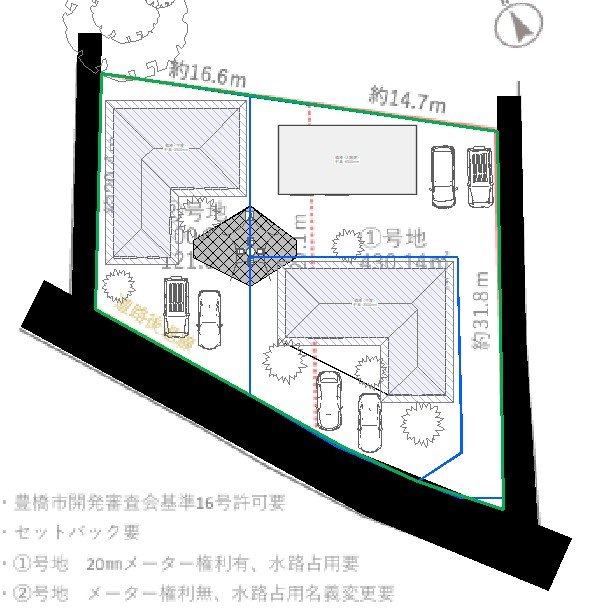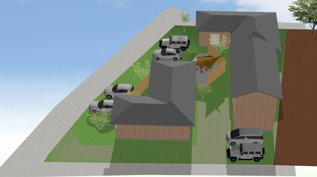 Aプラン(現在の敷地を3分割) 敷地を3分割し、中心に共有の屋外キッチンスペースを設ける オープンマインドな時は隣人と屋外で交流できる 目隠し塀で視線を遮り、プライベートな屋外部分も確保することで、 気分によって行動を変えることができる