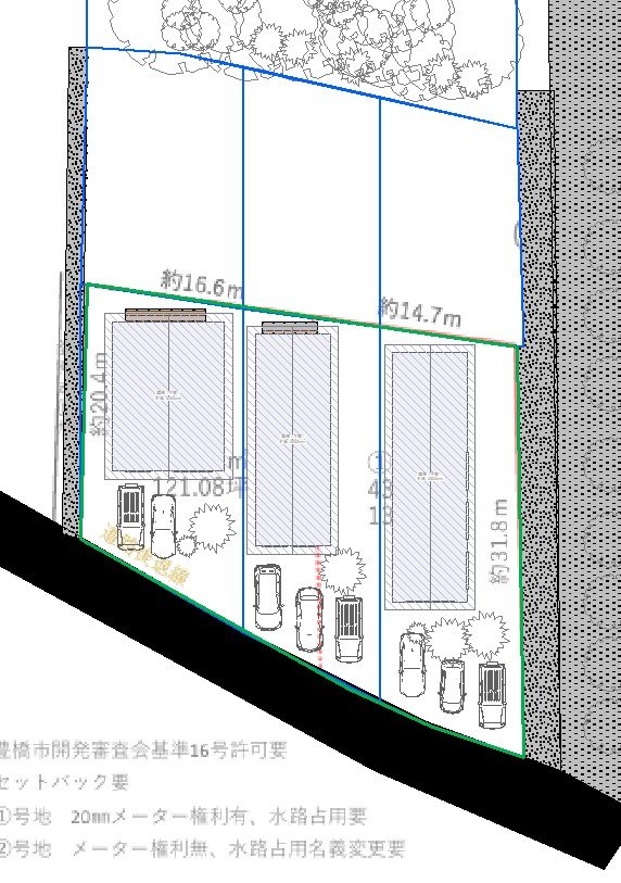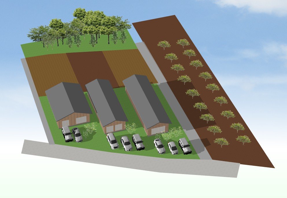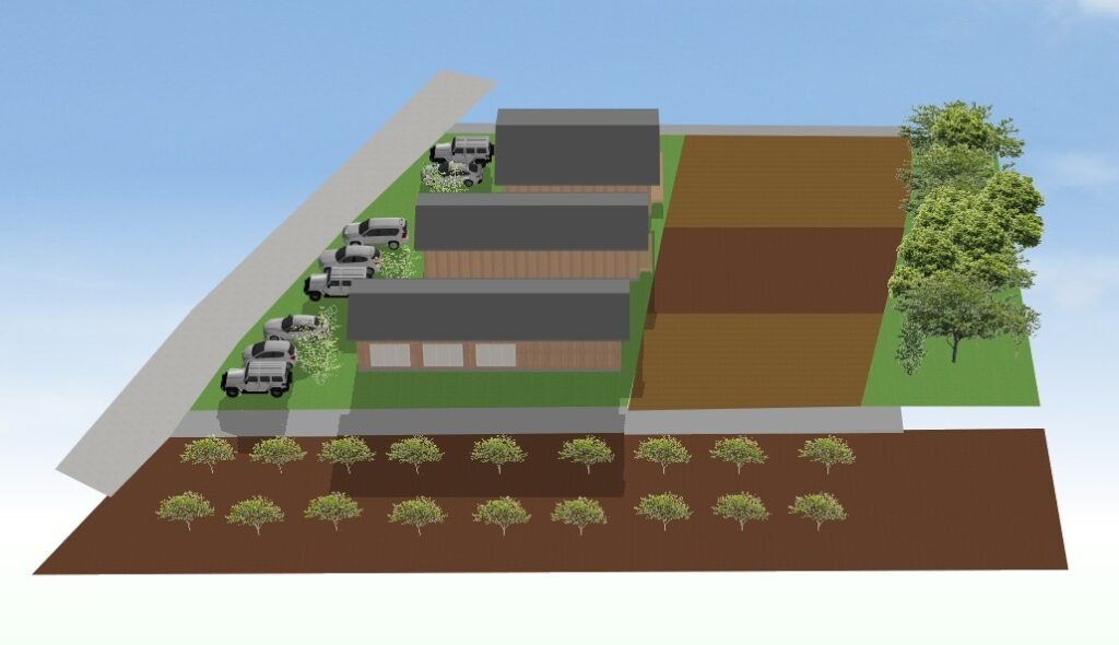 Cプラン(隣地畑を購入できた場合3分割) 宅地も、畑も3分割し、農地付分譲地として販売 考え方が近い人が住むはずなので、農業について相談しあう事もできる 状況によってはBプランとミックスして、店舗併用と農地付で組み合わせる事も検討